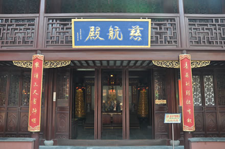 慈航殿內(nèi)供奉眼母娘娘(主治眼疾)、慈航大士(主平安)、天后娘娘(主出海平安)。慈航殿門上懸有對(duì)聯(lián)“善惡到頭總有報(bào),舉頭三尺有神明”,匾額“慈航普渡”。 月老殿