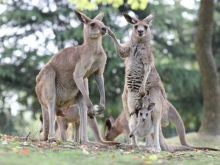 袋鼠是澳大利亞的國獸,有著獨特的育兒方式,袋鼠習(xí)慣用后肢跳躍前進(jìn),時速可達(dá)60公里。袋鼠坡草坪上的灰大袋鼠、赤大袋鼠組群生活,它們性格溫順。