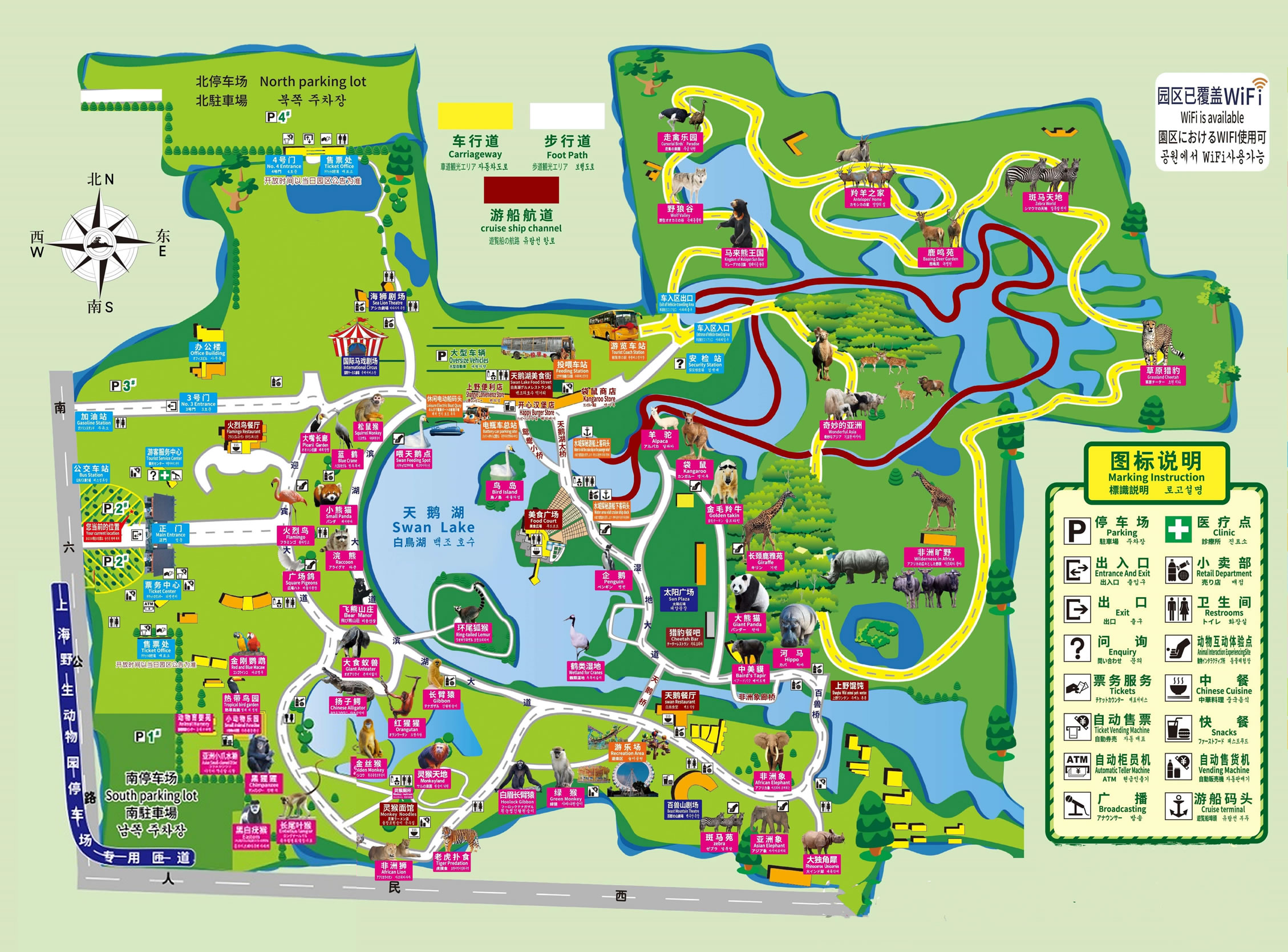 上海野生動物園現(xiàn)有車入?yún)^(qū)、步行區(qū)兩大區(qū)域。車入?yún)^(qū)分布著奇妙的亞洲、非洲曠野、優(yōu)雅長頸鹿、最美閃電俠、草原霸主、荒野大力熊、森林之王、白虎領(lǐng)地、野狼谷、馬來熊王國10大主題區(qū)域。步行區(qū)則分布著大熊貓館、鶴類濕地、火烈鳥展區(qū)、企鵝館、天鵝湖、羊駝苑、紅猩猩館、中美貘館、小動物樂園、鸚鵡館、河馬館、白眉長臂猿展區(qū)、大食蟻獸展區(qū)、鱷魚島、狐猴島、浣熊展區(qū)、金絲猴島、飛熊山莊、綠猴區(qū)、白虎展區(qū)、松鼠猴、小熊貓區(qū)、黑猩猩館、袋鼠坡、長頸鹿雅苑、亞洲象展區(qū)、金毛羚牛館、國禮非洲獅展區(qū)、熱帶鳥園、斑馬苑、非洲象展區(qū)、老虎撲食區(qū)、白頰長臂猿島、藍(lán)鶴、大獨角犀、大嘴長廊、靈猴天地、亞洲小爪水獺展區(qū)、太陽廣場共39個館區(qū)。