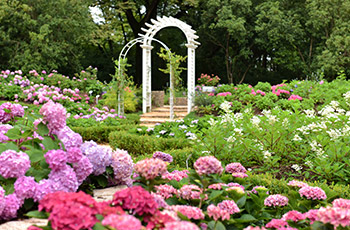 位于綠蔭茶室東側(cè),占地6000余平米,集觀花、休閑于一身,設(shè)有品種展示區(qū)、觀景平臺、休閑平臺、木棧道等;▓@中心區(qū)域種植了30個(gè)品種近500余盆色彩繽紛的八仙花,如“無盡夏”、“夢幻藍(lán)”、“紅粉佳人”等,結(jié)合白色的歐式拱門和落地盆景等,展現(xiàn)出浪漫的歐式風(fēng)情。而主入口處古樸的木亭、蜿蜒的旱溪和木質(zhì)棧臺等造景,又凸顯八仙花恬靜典雅之美。游客步入園中移步異景,從不同角度都能欣賞八仙花的風(fēng)姿卓絕。