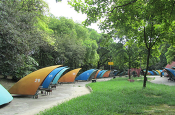 建園初期在“秋林愛晚”北部建了一處簡易碼頭。1993年投資8萬元,在簡易碼頭東面建造電動(dòng)船碼頭、鋼結(jié)構(gòu)玻璃瓦頂船塢棚及修理房,建筑面積1147平方米。1994年又投資40.2萬元,在“秋林愛晚”南部建造手劃船碼頭、水泥平頂船塢和管理房,建筑面積429平方米。共有手劃船62只、腳踏船10只、電動(dòng)船43只。