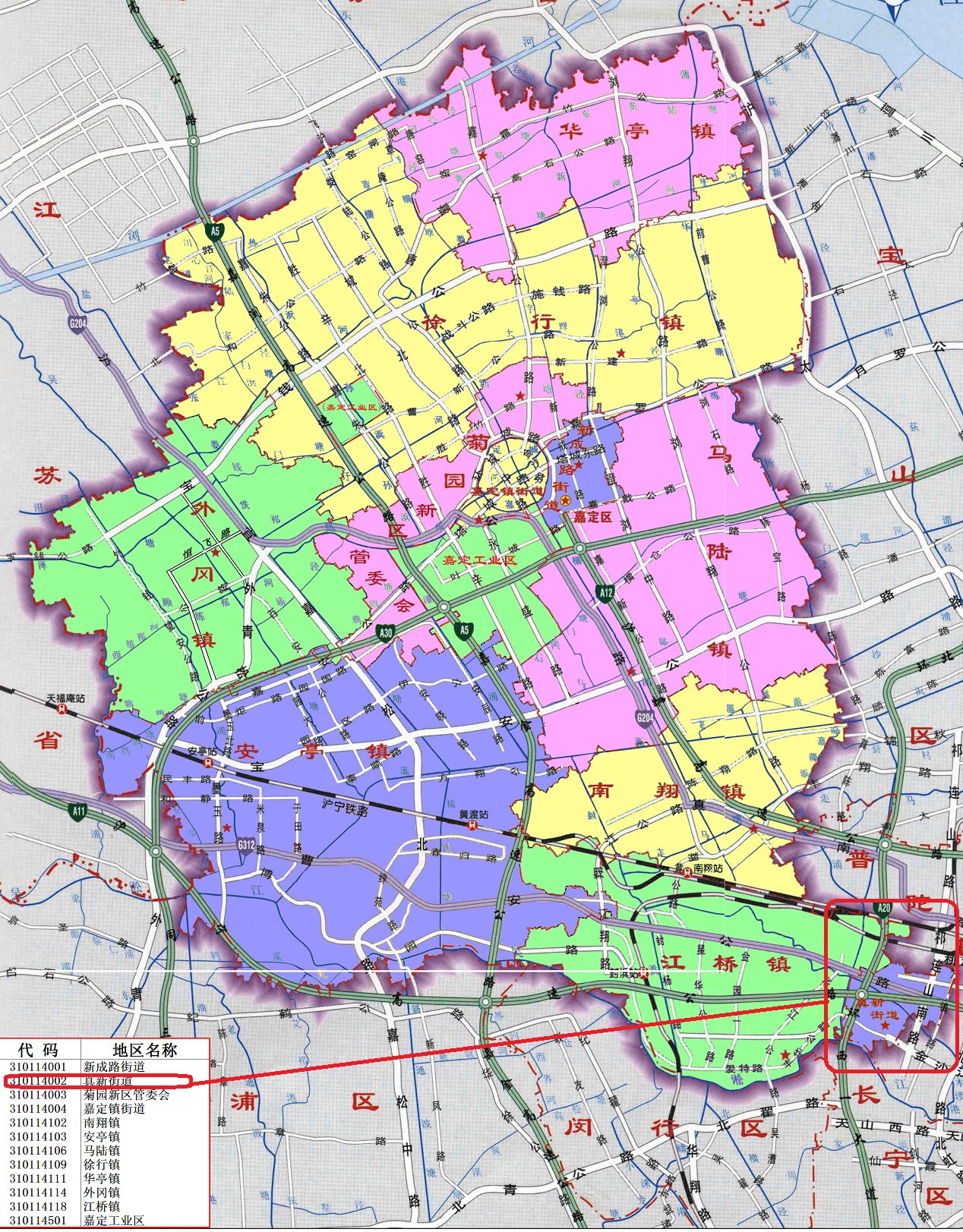 鎮(zhèn):南翔鎮(zhèn)、安亭鎮(zhèn)、馬陸鎮(zhèn)、徐行鎮(zhèn)、華亭鎮(zhèn)、外岡鎮(zhèn)、江橋鎮(zhèn)