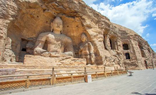 云岡石窟,原名靈巖寺、石佛寺。位于山西省大同市西郊17公里處的武州山南麓,是中國著名的石窟群之一。云岡石窟的開鑿始于北魏時期,北魏皇始三年(398年),道武帝拓跋珪將都城從盛樂(今和林格爾縣)遷至平城(今大同市),武州山成為盛樂與平城之間的交通要沖。文成帝拓跋濬即位后,令沙門統(tǒng)曇曜主持復法大業(yè)。在文成帝的支持下,曇曜選擇了鐘靈毓秀的武州山,"鑿山石壁,開窟五所,鐫建佛像各一,高者七十尺,次六十尺,雕飾奇?zhèn),冠于一?quot;。云岡的大部分洞窟在孝文帝元宏遷都洛陽前完工,但是造像工程則一直延續(xù)到正光年間(520~525年)。云岡石窟的開鑿歷時約150年,歷經(jīng)北魏、東魏、西魏、北齊、隋、唐等朝代,現(xiàn)存主要洞窟45個,大小窟龕252個,石雕造像59000余尊,是中國石窟藝術寶庫中的瑰寶。