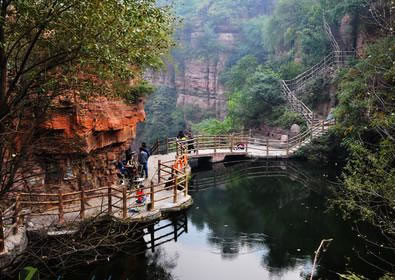 紅崖峽谷在太岳山西麓,屬太行山系,是中生代燕山運(yùn)動(dòng)時(shí)期隆起,又經(jīng)過(guò)新生代西馬拉雅運(yùn)動(dòng)改造形成的山地。其地貌屬大起伏喀斯特侵蝕中山,屬于石質(zhì)山區(qū),地貌類(lèi)型多樣,巖石主要有片麻巖、花崗巖、石灰?guī)r和沙石巖。