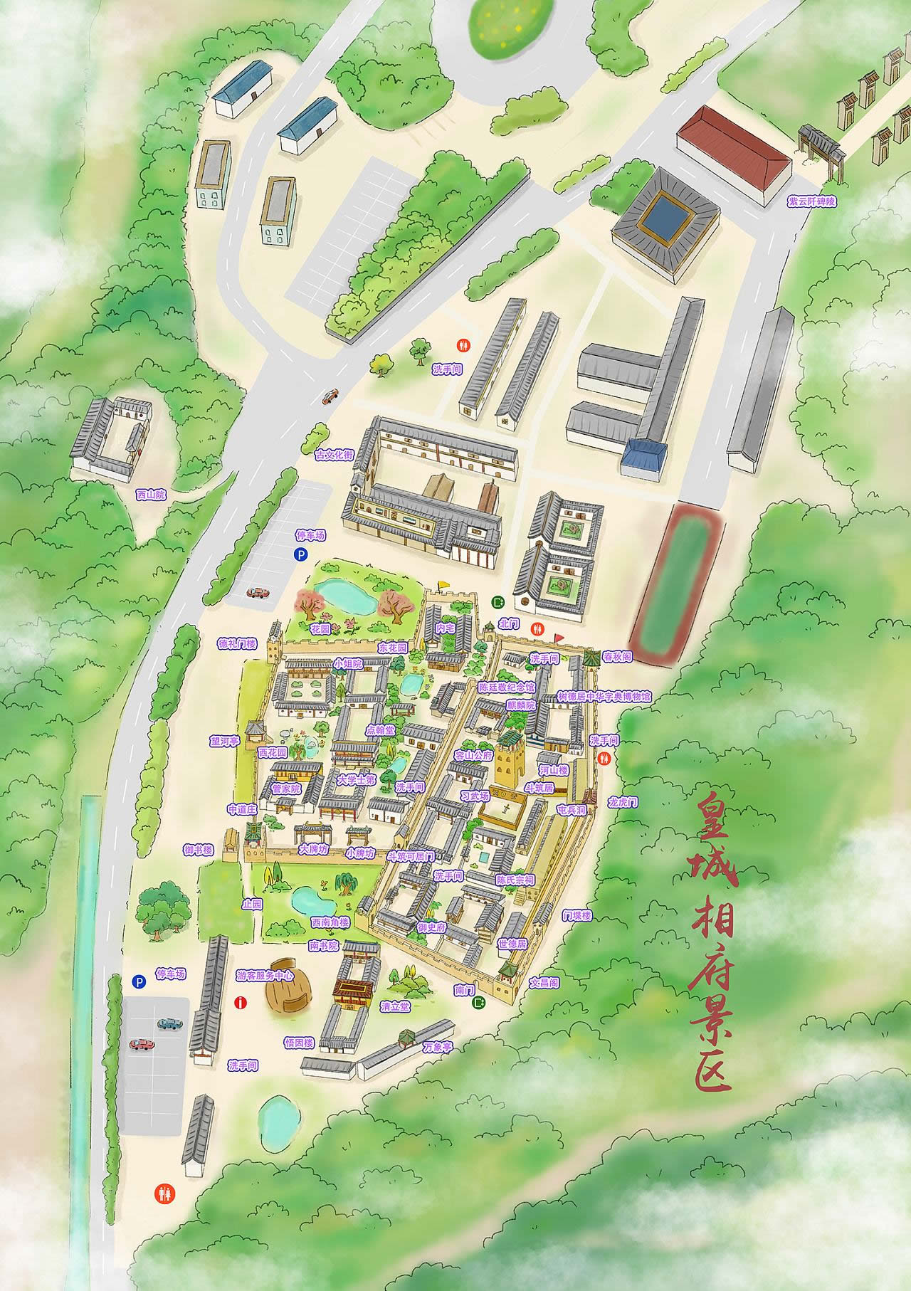皇城相府建筑群分內(nèi)城、外城兩部分,有院落16座,房屋640間,總面積36580平方米。內(nèi)午亭山莊導(dǎo)航圖城始建于明崇禎五年(公元1632年),有大型院落八座。外城完工于康熙四十二年(公元1703年),有前堂后寢、左右內(nèi)府、書院、花園、閨樓、管家院、望河亭等。