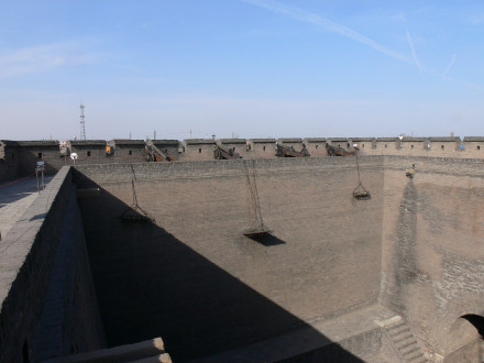 康熙四十三年(1703年)因皇帝西巡路經(jīng)平遙,而筑了四面大城樓,使城池更加壯觀。平遙城墻總周長(zhǎng)6163米,墻高約12米,把面積約2.25平方公里的平遙縣城一隔為兩個(gè)風(fēng)格迥異的世界。