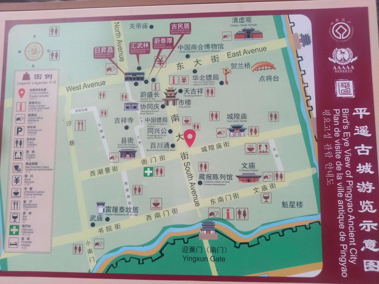 平遙古城素有“中國(guó)古建筑的薈萃和寶庫(kù)”之稱,文物古跡保存之多、品位之高實(shí)為國(guó)內(nèi)所罕見。其中有始建于西周,擴(kuò)建于明洪武3年(1370年),規(guī)模宏大,氣勢(shì)雄偉的國(guó)內(nèi)保存最完整的古城墻;有始建于北漢天會(huì)七年(963年)被列入我國(guó)第三位的現(xiàn)存最珍貴的木結(jié)構(gòu)建筑鎮(zhèn)國(guó)寺萬佛殿。殿內(nèi)的五代彩塑堪稱珍品,是研究中國(guó)早期彩塑的樣本;有始建于北齊武平二年(571年)、被譽(yù)為“中國(guó)古代彩塑藝術(shù)寶庫(kù)”,現(xiàn)存宋元明清彩塑2052尊的雙林寺;有中國(guó)宋金時(shí)期文廟的罕見實(shí)物——文廟大成殿;有中國(guó)金融上的開山鼻祖,被譽(yù)為“天下第一號(hào)”、“匯通天下”的“日升昌”票號(hào);有始建于唐顯慶二年,國(guó)內(nèi)古建筑中罕見的“懸梁吊柱”奇特結(jié)構(gòu)清虛觀。觀內(nèi)20余尊木雕神像是研究中國(guó)古代木雕造像藝術(shù)和道教發(fā)展的稀有之物;有遍布古城內(nèi)外1000通碑刻及年代不一、形式多樣、色彩續(xù)紛的各種琉璃實(shí)物。同時(shí),平遙古城是中國(guó)古代民居建筑的薈萃中心之一。古城內(nèi)現(xiàn)存4000處古、近代民居建筑中,有400余處典型地體現(xiàn)著中國(guó)古、近代北方民居建筑的風(fēng)格和特點(diǎn)。