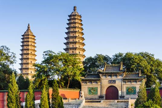 永祚寺雙塔,雄偉異常,雙雙聳立如筆,故有“文筆雙塔”之譽,更被譽為太原的標志。雙塔并非同時建成,東南塔稍早,西北塔較晚。兩塔相距60米,取“真言密教以十六數表圓滿無盡”之意。二塔均為全磚石結構,只在各層角檐內裝有一根挑木,構建技巧十分精湛。