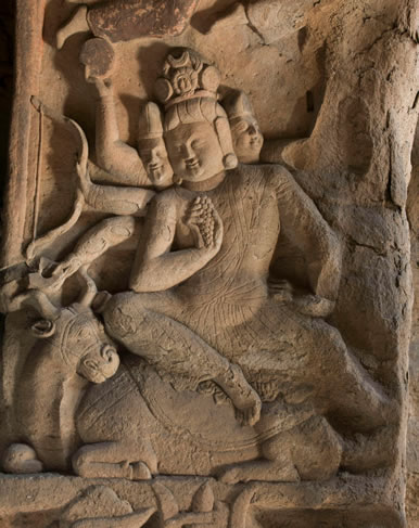 窟門拱頂正中雕一朵團(tuán)蓮,四周飛天起舞。內(nèi)側(cè)上拱邊框為連續(xù)排列的忍冬葉,周圍雕伎樂天人。拱內(nèi)側(cè)壁分為上下層,下層為天王門神,逆發(fā)胡人形象,手持金剛杵或三叉戟。上層雕出多頭多臂神像,東壁雕三頭四臂,西壁雕三頭六臂。