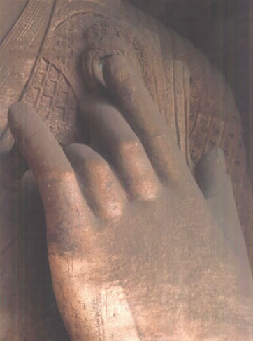 大佛兩側(cè),原本各有立佛、立菩薩,呈三世佛、五尊像布局,可惜今天僅有東壁一佛獨(dú)立。東立佛高約9.5米,磨光肉髻,圓臉大耳,深目高鼻,著通肩式佛衣;右手舉在胸前,施無畏印,左手握衣角下垂,跣足立于蓮臺之上。其衣紋雕刻與造像特征,極具西域藝術(shù)神韻。西壁立佛,大約當(dāng)年與東立佛相對侍立,但早已坍塌無形,現(xiàn)在僅殘留圓形頭光和赤裸的雙足及其蓮臺。