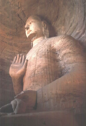 早期石窟:即今第16~20窟,亦稱為曇曜五窟。根據(jù)《魏書·釋老志》(卷114)記載:“和平初,師賢卒。曇耀代之,更名沙門統(tǒng)。初,曇耀于復(fù)法之明年,自中山被命赴京,值帝出,見于路,御馬前銜耀衣,時人以為馬識善人,帝后奉以師禮。曇曜白帝,於京城西武州塞,鑿山石壁,開窟五所,鐫建佛像各一,高者七十尺,次六十尺,雕飾奇?zhèn),冠于一世。”文中記述的開窟五所,就是當(dāng)時著名的高僧曇曜就選擇了鐘靈毓秀的武州山,開鑿了雄偉壯觀的曇曜五窟,揭開了云岡石窟開鑿的序幕。第16~20窟即帝王象征的曇曜五窟,以造像的風(fēng)格和創(chuàng)作的技法來看,是云岡全窟群中最早的五個窟。平面為馬蹄形,穹隆頂,外壁滿雕千佛。主要造像為三世佛(過去、現(xiàn)在、未來),佛像高大,面相豐圓,高鼻深目,雙肩齊挺,顯示出一種勁健、渾厚、質(zhì)樸的造像作風(fēng)。其雕刻技藝?yán)^承并發(fā)展了漢代的優(yōu)秀傳統(tǒng),吸收并融合了古印度犍陀羅、秣菟羅藝術(shù)的精華,創(chuàng)造出具有獨(dú)特的藝術(shù)風(fēng)格,這是中外融合所形成的新的藝術(shù)風(fēng)格。