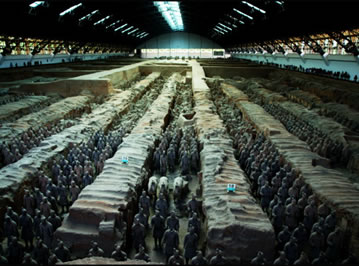兵馬俑坑位于秦始皇帝陵?yáng)|側(cè)1.5公里處西楊村南,是秦始皇帝陵的陪葬坑。已發(fā)現(xiàn)三座,分別編為一、二、三號(hào)兵馬俑坑。三座俑坑占地面積達(dá)2萬(wàn)多平方米,內(nèi)有和真人、真馬大小相似的陶俑、陶馬近8000件。有車(chē)兵、騎兵和步兵等不同的兵種,排列整齊有序。