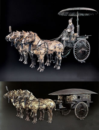 銅車(chē)馬是秦始皇的陪葬品之一,象征著秦始皇鑾駕的一部分。銅車(chē)馬的形制是模仿實(shí)實(shí)在在真車(chē)的形狀。以前考古發(fā)現(xiàn)的車(chē)都是木質(zhì)的,出土?xí)r已腐朽,銅車(chē)馬的出土使今人能夠清楚地看到古代御用車(chē)駕的真實(shí)面貌。銅車(chē)馬是按秦始皇御用車(chē)隊(duì)中屬車(chē)二分之一的比例縮小制成的,車(chē)蓋以及車(chē)輿內(nèi)外彩繪著精美的紋樣;兩乘銅車(chē)馬上的金銀飾品重達(dá)14公斤,顯示了銅車(chē)馬高貴的等級(jí)。