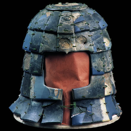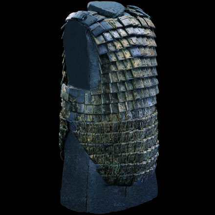 此展品為秦代的石器,通長(zhǎng)64.00厘米,出土于秦始皇帝陵K9801陪葬坑。鎧甲由前、后身甲和一對(duì)披膊組成,共有甲片380片。鎧甲的開(kāi)合口位于右側(cè)肩、胸的交接處。