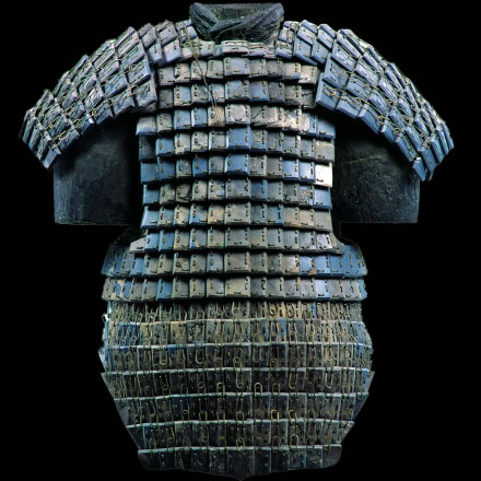 此展品為秦代的石器,通長(zhǎng)75.00厘米,披膊長(zhǎng)20.00厘米,出土于秦始皇帝陵K9801陪葬坑。鎧甲由前、后身甲和一對(duì)披膊組成,共有甲片612片。