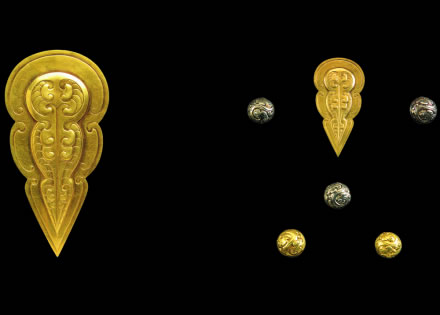 此展品為秦代的金器,金當(dāng)盧是秦始皇陵銅馬車(chē)馬頭部飾物。正面有細(xì)線(xiàn)勾畫(huà)出流云紋,中部有兩條蟠虺紋組成蟬狀紋樣,紋樣凸起呈淺浮雕形。當(dāng)盧背面印刻“十二”,鈕上有“上”銘文。