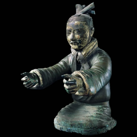 此展品為秦代的陶器,通高51.00厘米,重51.92千克,出土于秦始皇帝陵西側(cè)銅車(chē)馬陪葬坑,為秦陵二號(hào)銅馬車(chē)上的御官俑。御手通體彩繪,頭戴鹖冠,身穿長(zhǎng)襦,腰束革帶,下穿長(zhǎng)褲,與秦俑坑出土的高級(jí)軍吏俑相似,也是具有一定爵位的軍吏。 |