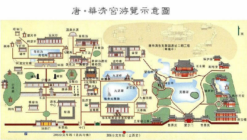 從文獻記載和野外的實際考察中,大抵可知華清宮的范圍是:南至驪山西繡嶺第一峰(即周烽火臺),北到今縣城北什字。東至石甕谷(寺溝)。西到鐵路療養(yǎng)院西側(cè)的牡丹溝。宮城(即羅城),南至山根,北到今縣城南什字,東至東窯村,西到游泳池。1967年新華書店在南什字西北角修建營業(yè)樓,發(fā)現(xiàn)了用青石砌成的宮城北墻的墻基。1981年春,城建單位在西街丁字形路北,也發(fā)現(xiàn)了同樣的北墻基。1982年冬于寺溝村南的山坡上探出東繚墻兩段。從調(diào)查和發(fā)掘所見遺跡及文獻資料所記,華清宮的建筑布局嚴謹,曲折縈回,規(guī)模宏大。唐玄宗以民脂民膏,建此豪華宮苑,供一己之歡娛,然曾幾何時,“漁陽鼙鼓”驚破了他的美夢。華清宮樓殿湯池,遂漸次破壞,自宋以至明清,其原有建筑已蕩然無存。記其遺跡,乃以彰我民族之文化,并以此為借鑒,建立一個新時代的風景旅游區(qū),供廣大人民群眾游覽。唐代華清宮充分利用了有利地形,使其成為一座結(jié)構(gòu)嚴謹、富麗堂皇的龐大宮殿建筑群。主要殿舍以溫泉為中心,構(gòu)成華清宮的核心。然后向山上和山下展開,利用地形特點,布設(shè)不同類型和用途的樓閣亭榭,同時還有青松翠柏、荔枝園、芙蓉園、梨園、椒園、東花園等分布其間,把整個華清宮妝扮得格外妖嬈。華清宮的建筑依山面水,鱗次櫛比,除宮城(羅城)外,還有繚墻環(huán)繞?潐χ,又羅列不少建筑,清乾隆《臨潼縣志》稱:“湯井殊名,殿閣異制,園林洞壑之美,殆非人境”。