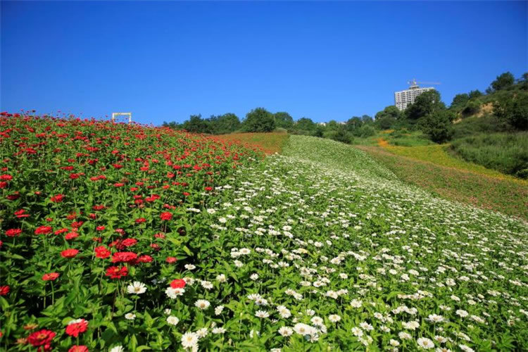 沿著小路拾級而上,百花爛漫,林木蔥郁,紅色的百日草、粉色的格;ā⒆仙霓挂虏、嬌艷欲滴的虞美人、絢麗多姿的醉蝶......從山谷中傾瀉而下,如同一條彩色的小溪,置身其中,好似沉浸于花香鳥語的蝴蝶一般翩翩起舞、流連忘返。