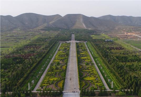 橋陵陵園略呈長(zhǎng)方形,東西長(zhǎng)2871米,南北長(zhǎng)2836米,總面積852萬(wàn)平方米。四面開(kāi)辟有門(mén),四角有樓。歷經(jīng)千年風(fēng)蝕雨剝,唐橋陵所保留的石華表、石鴕鳥(niǎo)、石馬、石人、石獨(dú)角獸、石獅等五十余尊巨大石刻依然形態(tài)清晰,生動(dòng)自然,其中的38尊排列在寬達(dá)110米、長(zhǎng)625米的神道兩旁。
