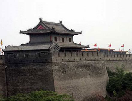 西安城墻完全圍繞“防御”戰(zhàn)略體系,城墻的厚度大于高度,穩(wěn)固如山,墻頂可以跑車和操練。墻高12米,頂寬12—14米,底寬15—18米,周長(zhǎng)13.74千米。城門有四:東長(zhǎng)樂門,西安定門,南永寧門,北安遠(yuǎn)門。每門城樓三重:閘樓、箭樓、正樓。正樓高32米,長(zhǎng)40余米,為歇山頂式,四角翹起,三層重檐,底層有回廊環(huán)繞,古色古香,巍峨壯觀。