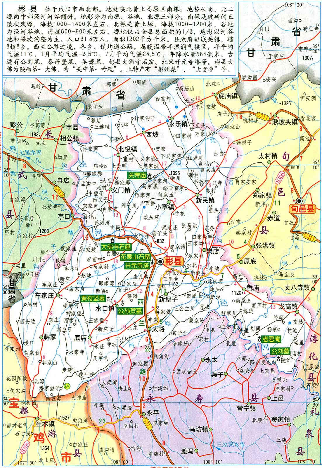 彬縣位于陜甘兩省交界處,南距咸陽120公里、西安150公里,北距甘肅平?jīng)?60公里,是連接秦隴的咽喉要道。全縣版圖形似正寫的“人”字,涇河自西而東斜貫其中,將全縣分為南北兩塬一道川。全縣轄8鎮(zhèn)8鄉(xiāng)246個行政村,總?cè)丝?2萬,其中農(nóng)業(yè)人口28.8萬,總面積1183平方公里,耕地面積60萬畝。彬縣歷史悠久,是中國古代農(nóng)業(yè)的發(fā)祥地之一。