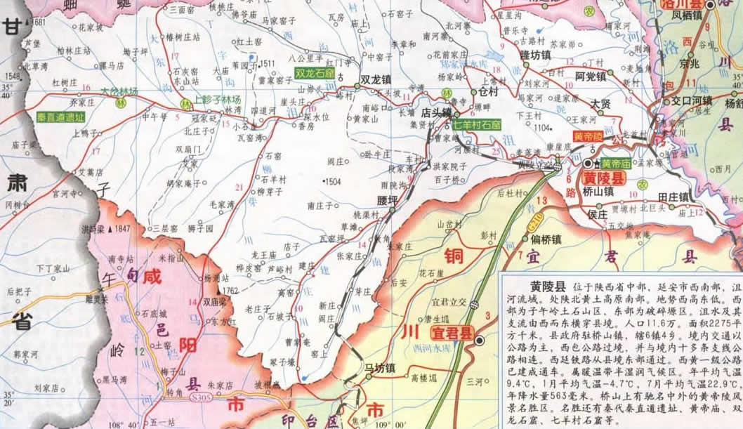 縣境內(nèi)交通發(fā)達、公路、鐵路運輸暢通,網(wǎng)絡(luò)密布。以西包210國道為主的9條主干公路連接成網(wǎng),縣境內(nèi)通車里程561. 7公里,全縣192個行政村通油路,與主干公路聯(lián)網(wǎng)。西(安)銅(川)一級公路的延伸工程黃銅一級公路已建成通車,黃(陵)延(安)一級公路已經(jīng)建成通車。西(安)延(安)鐵路橫貫縣境南北,秦(家川)店(頭)運煤專用鐵路直達黃陵礦區(qū),年運輸量可達600多萬噸?h境內(nèi)黃渠專用機場為空運提供了方便,鐵路、公路、航空運輸已經(jīng)逐步形成立體網(wǎng)絡(luò)。