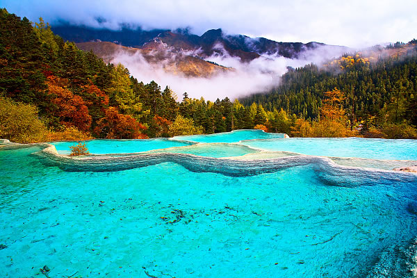 黃龍風景名勝區(qū)面積700平方千米,與九寨溝相距100千米,海拔1700~5588米。核心區(qū)域點綴著三千多個彩池。以結(jié)構(gòu)奇巧、色彩豐艷的地表鈣華景觀為主景,由黃龍溝、丹云峽、牟尼溝、雪寶鼎、紅軍長征紀念碑碑園等組成。主要景觀集中于長約3.6公里的黃龍溝,溝內(nèi)遍布碳酸鈣華沉積,并擁有豐富的動植物資源。