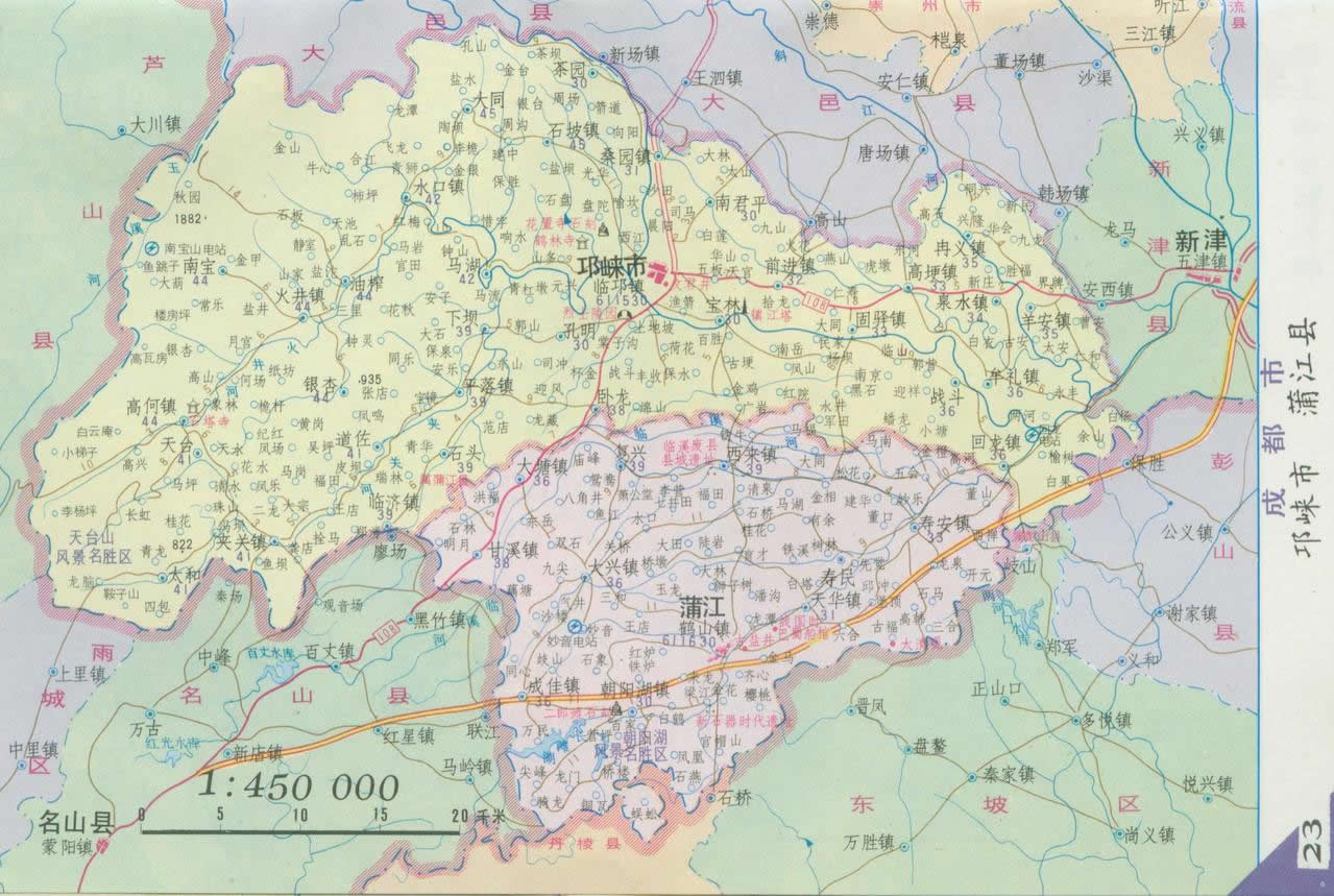 蒲江縣全境地貌概括為“三山”夾“兩水”,狀若臥放之甕壇。“三山”,系指峙于境南之長秋山,為山地,支脈為深丘;踞于境北之大五面山、亙于境中之小五面山,為淺丘,曲伸于百里平壩之間。“兩水”,系指介于“三山”之間,穿越全境,出“壇口”,匯邛水,入岷江之蒲江河、臨溪河。二河沿流路展布帶狀平壩,北東延展與成都平原主體銜接。“三山”夾流“兩水”,山水錯列,構成千姿百態(tài)、雄偉壯麗之地貌景觀:山地峰巒重疊,陡崖峭壁;深丘谷 狹溝深,壟岡綿延;淺丘丘坡起伏,臺面開闊;平壩坦蕩如砥,河渠交錯。