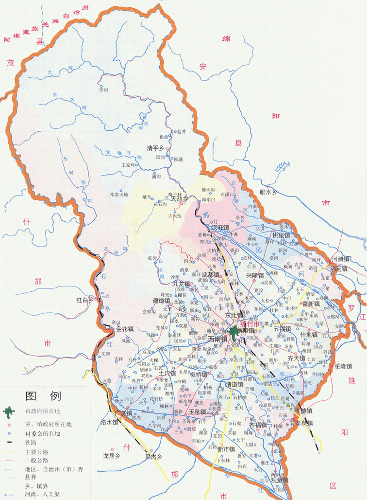 鎮(zhèn):劍南鎮(zhèn)、玉泉鎮(zhèn)、什地鎮(zhèn)、富新鎮(zhèn)、孝德鎮(zhèn)、新市鎮(zhèn)、板橋鎮(zhèn)、興隆鎮(zhèn)、金花鎮(zhèn)、廣濟(jì)鎮(zhèn)、土門(mén)鎮(zhèn)、遵道鎮(zhèn)、綿遠(yuǎn)鎮(zhèn)、拱星鎮(zhèn)、九龍鎮(zhèn)、漢旺鎮(zhèn)、齊天鎮(zhèn)、西南鎮(zhèn)、東北鎮(zhèn)
