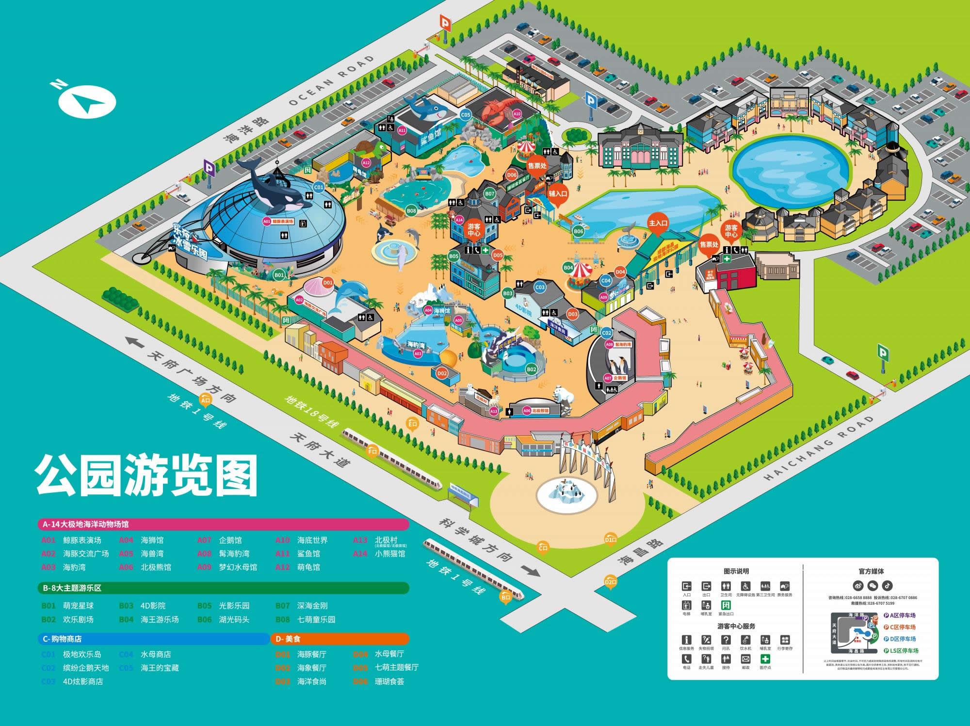 作為承載科普、互動、歡樂、體驗為一體,戶外游樂區(qū)+室內(nèi)動物場館+大型演藝場結(jié)合的海洋主題公園,成都海昌極地海洋公園擁有鯨豚(白鯨、海豚)、北極熊、企鵝、海豹、海獅、萌龜、水母、北極狐、北極狼、小熊貓 [4] 等14大海洋動物場館,以及海王游樂場(器械游樂設(shè)備)、萌寵星球(水陸空動物互動區(qū))、光影樂園、4D影院、深海金剛科技體驗館、七萌童樂園(夏季為親水玩水區(qū))等8大主題游樂區(qū)。游客入園,還能欣賞到《鯨豚聯(lián)盟》、《人鯊共舞》、《海獅運動會》等海洋科普秀,夏日還有快樂無比的國際花車巡游和戲水狂歡限時上演。