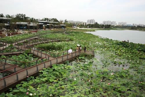 整個荷博園沿觀音湖布局,依托外湖種荷、內(nèi)湖布荷,在荷花成為景致的同時,又在最大程度上與原來的自然環(huán)境共生,渾然天成。荷在城中,城在蓮里,遂寧就像一個大花園,處處可賞荷,步步皆是景,自然與繁華,傳統(tǒng)與現(xiàn)代,在這里可以如此和諧。此外,園內(nèi)所有的燈光、雕塑、廊、橋等皆是風(fēng)景,而這些景致又全采用蓮的元素,整個景致和諧統(tǒng)一。園內(nèi)主游線串聯(lián)起主展館、芙蓉花階、葉子洲、葉子廣場、碼頭等十大特色觀荷景點,營造多重的觀荷感受,時而岸上觀荷旖旎,時而水岸望荷輕盈。