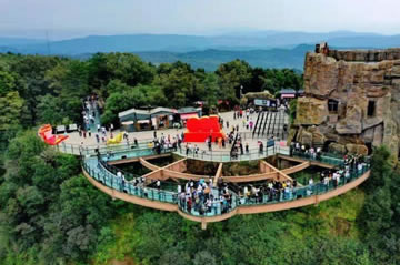 “懸空玻璃景觀平臺”位于景區(qū)的最高點(diǎn),劍門關(guān)景區(qū)大劍山主峰上,該平臺建成面高程為1163.800m,懸挑部分采用鋼結(jié)構(gòu),其鋼結(jié)構(gòu)的鋼梁采用兩種“工”字疊加組成。主景觀平臺懸空跨度25mm,平臺面層采用高強(qiáng)多層疊合玻璃鋪面,玻璃厚度約6cm,平臺距崖底高約150m,懸空玻璃觀景臺懸挑長度為世界第二、亞洲第一,僅次于美國科羅拉多大峽谷國家公園懸空玻璃觀景廊橋。橋面設(shè)計(jì)寬度為3米,橋梁凈跨約20米古樹,景觀玻璃平臺與古樹,古木石雕等相呼應(yīng),游客行走其上,可高空俯瞰體驗(yàn)劍門關(guān)景區(qū)的雄、奇、險、秀。