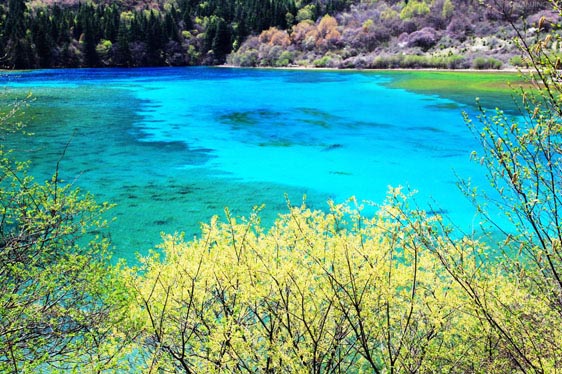 春風(fēng)吹拂,沉睡的九寨溝蘇醒了。冰雪融化,新綠發(fā)芽,春水的顏色映著山色,嬌嫩得讓人不忍探視,仿佛只要輕輕地一口氣都能讓它消失。水邊道旁,鬧哄哄開滿了不知名的美麗山花,桃紅、絳紫、靚藍、鵝黃,繁華似錦,爛漫一路。溫柔而慵懶的春陽吻接湖面,愛撫春芽,也悸動了你久閉的心門......