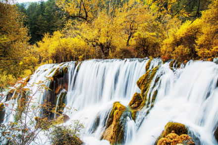 諾日朗瀑布海拔2343米,高24.5米、寬320米,是中國最寬的高山鈣華瀑布。滔滔流水自諾日朗群海而來,從瀑頂樹叢中傾瀉而下,像數(shù)條潔白的哈達,水勢浩大,聲震山谷。寒冬時節(jié),瀑布成了一幅巨大的冰幔,無數(shù)的冰柱懸掛在陡崖之上,成為罕見的冰晶世界,造型各異的冰雕迎光透著幽幽的藍色魅惑,是九寨溝六絕之一“藍冰”。