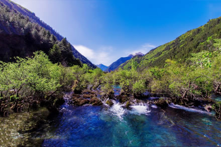 孔雀河道是從五花海出水口深谷里的一條河道。孔雀河道像是走在一副最濃烈的色彩創(chuàng)造出來的油畫里,又猶如孔雀羽一樣,將塵世間最美麗的藍和綠都融合在一起。