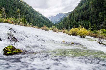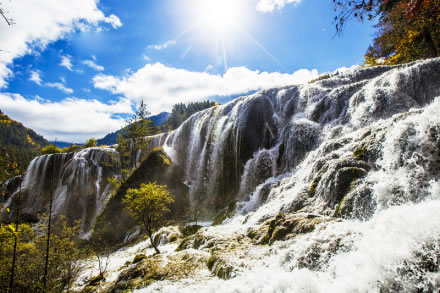珍珠灘海拔2450米,灘面寬112.3米、長189米,平均坡度20度,相對高差15米,是九寨溝最寬闊的灘面,為碳酸鈣沉積而成的大型鈣華堆積臺地。陽光下,湍流在凹凸不平的灘面上宣泄而下,濺起無數(shù)水珠,宛如粒粒潔白的珍珠,晶瑩奪目,故得此名。