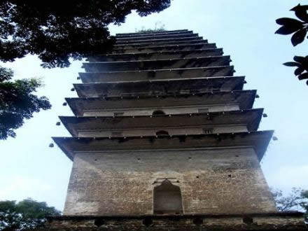 靈寶塔又名凌云塔,因其聳立在凌云寺后的靈寶峰巔,故以山峰命名。塔建于唐代,塔形呈密檐式四方錐體,磚砌而成,坐東向西,高38米,共十三級(jí)。塔體中空,內(nèi)確 ”石階沿塔軸盤旋至頂。塔頂為四角攢尖式。靈寶塔的結(jié)構(gòu)和風(fēng)格與西安小雁塔相似。