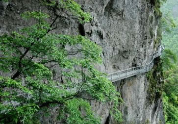 棧道開鑿于1983年初,1984年竣工,同年十月開放,全長(zhǎng)約500米,北端與大佛相連,南端與碧津樓相連,與大佛右側(cè)的九曲棧道一起構(gòu)成一條回環(huán)曲折的旅游路線。