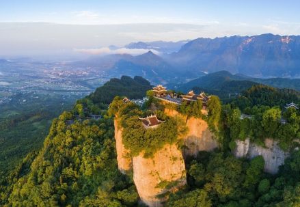 位于江油城北25千米的涪江東岸,是國家地質(zhì)公園、國家重點(diǎn)文物保護(hù)單位。整座山峰巖體裸露,丹赤如霞,三峰矗立,似一道畫屏,屬典型的礫巖丹霞地貌。自麓至頂約5千米許,行道迂回盤旋,林木蒼翠,景色秀麗。竇圌山以其山形外貌似圌(上小下大的糧屯)礫石如豆,故名圌山,到了唐高宗時(shí)期,彰明縣主簿竇子明慕此山清奇幽秀而棄官隱居山上,修道成功羽化飛仙,于是“山不在高,有仙則名”從此圌山冠以竇姓,由此得名竇圌山。詩仙李白少年游山時(shí)被如畫的美景所吸引,留下了膾炙人口的千古絕句:“樵夫與耕者,出入畫屏中”。