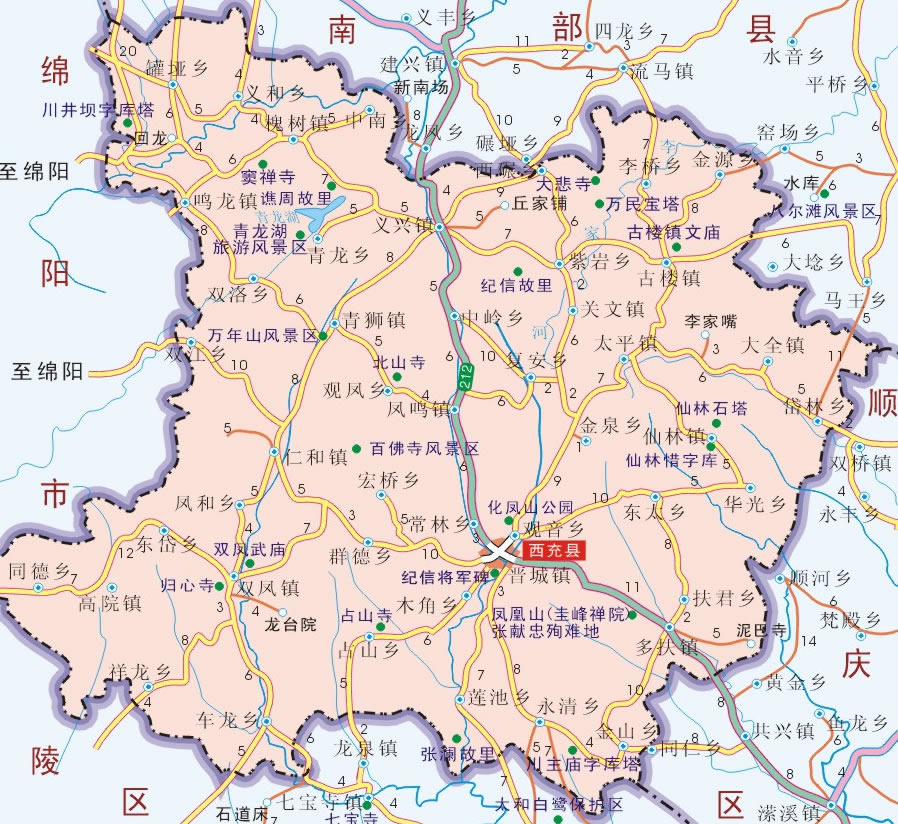 高速公路 廣南高速公路:廣元——西充——南充;成巴高速公路:成都——中江——三臺(tái)——鹽亭——西充——南部——儀隴——巴中;南綿高速公路:南充——西充——鹽亭——綿陽;遂巴高速公路:遂寧——西充——巴中