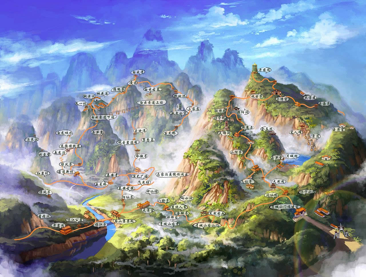 青城山分前、后山。前山是青城山風(fēng)景名勝區(qū)的主體部分,約15平方千米,景色優(yōu)美,文物古跡眾多,主要景點有建福宮、天然圖畫、天師洞、朝陽洞、祖師殿、上清宮等;后山總面積100平方千米,水秀、林幽、山雄,高不可攀,直上而去,冬天則寒氣逼人、夏天則涼爽無比,主要景點有金壁天倉、圣母洞、山泉霧潭、白云群洞、天橋奇景等。