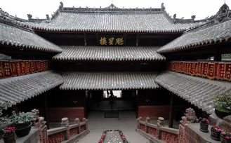 家慶堂屋頂為歇山頂,整個(gè)殿宇雄偉華麗,它的屋頂脊飾很有特色。正脊正中有三重樓閣,樓閣之上有寶頂,樓閣后底部雕塑有彌勒佛;9個(gè)脊梁之上都有蹲獸,在4個(gè)翼角戧脊之上塑有天上四靈,以正四方。什么是“四靈”呢?就是青龍、白虎、朱雀、玄武;為何要塑“四靈”?因?yàn)楣湃顺S小白簖堄一⒈俨幌,朱雀玄武順陰陽”的說法。在歇山下邊的正中位置,還有“上有仙人不知老,渴飲玉泉饑食棗”等生動(dòng)有趣的裝飾性塑像。如果站在代表二十四孝的石階下仰望整個(gè)家慶堂時(shí),更會(huì)有華麗多彩、猶如海市蜃樓的感覺。