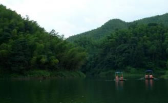 湖中有兩座不同的原形小島。湖水碧綠清澈,四周翠竹掩映,綠草如茵,附近有梅坪、古佛洞、涼風(fēng)洞、照妖鏡、七疊石等古跡。當太陽起落時,滿湖金色,萬道霞光,絢麗多彩。湖上可蕩舟劃筏,湖邊亭閣,也可品茗小酌。夏秋之夜,山巒沉郁而秀朗,清風(fēng)徐來,漣漪翩翩,湖邊納涼閑話,別有情趣。
