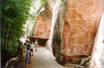 天寶寨相傳建于1862年清代咸豐年間,地方官府為防御石達開太平軍入川而建。地形險要,易于防守,古寨長1500米,高20米,寬10米左右,洞的頂部均系巖石構(gòu)成,多為半邊洞,依洞而建,曲折奇特,內(nèi)有13道堅固的石寨門,易守難攻。洞的四周翠竹周合,途中有罕見的巨大蘑菇石,高有10多米,上面的石塊如傘蓋,危而不墜。傳說此石原是仙寓洞道長使用的傘,放在此地后化作黃色的石頭,故取名“黃傘石”。洞中鑿了《三十六計》,按照每計的內(nèi)容,精選群眾比較熟悉的戰(zhàn)例,雕刻成巨幅圖畫,巍然矗立于懸崖絕壁之上。