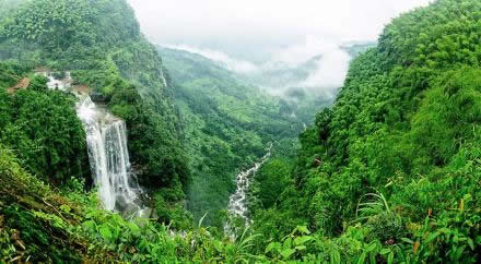 七彩飛瀑又名落魂臺!督部h志》載:“萬嶺箐南北飛瀑,殆似廬山”。不擇地而出的泉水,使得深邃幽深的竹海充滿靈氣,山巖跌宕處,每每作了懸泉飛瀑。山間數(shù)十條姿態(tài)各異的瀑布中,最為壯觀的,當數(shù)七彩飛瀑。七彩飛瀑處在石鼓山和石鑼山之間的葫蘆谷中,從深林里流出的水潦河,在回龍橋下分為四級瀉下懸崖,落差近200米,蔚為壯觀。瀑布上頭,還有石龍過江、孟獲墳、古較場等景點。一湖碧水映藍天翠竹;湖水的寧靜,與瀑布的飛動相互映照。
