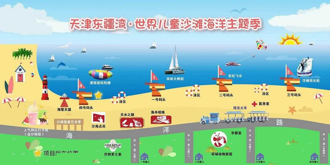 景區(qū)還將增添激情水上飛碟、快艇漂移、水上沙發(fā)、水上UU船、帆船、海上滑梯、海上蹺蹺板等數(shù)十項(xiàng)大型游樂設(shè)施,讓這里真正成為海上“迪士尼”。作為配套設(shè)施,在人工海灘西側(cè)修建濱海路,全長1.3公里,道路寬24米,為景區(qū)內(nèi)步行觀景道路,道路兩側(cè)綠化面積約6700平方米。綠化廣場(chǎng)總面積12萬平方米,景區(qū)停車場(chǎng)總面積約4700平方米。景區(qū)設(shè)置為沙灘親水區(qū)、沙灘游泳休閑區(qū)、水上運(yùn)動(dòng)休閑中心和水上休閑娛樂區(qū)。其中,位于沙灘游泳休閑區(qū)已經(jīng)建成的海景會(huì)所,是目前國內(nèi)北方最大的單體木結(jié)構(gòu)海景酒店會(huì)所,設(shè)有餐飲、住宿、淋浴、商務(wù)、娛樂等設(shè)施,并提供有地道的天津狗不理包子。另外,會(huì)所周邊正在建設(shè)游艇會(huì)所、五星級(jí)酒店、運(yùn)動(dòng)廣場(chǎng)、低密度住宅、高爾夫球場(chǎng)等設(shè)施。配套服務(wù)設(shè)施將逐步完善。