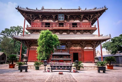 獨樂寺山門是我國現(xiàn)存最早的廡殿頂山門,山門面闊三間,進深兩間,中間做穿堂,正脊兩端的鴟吻,造型生動古樸為,遼代原物。