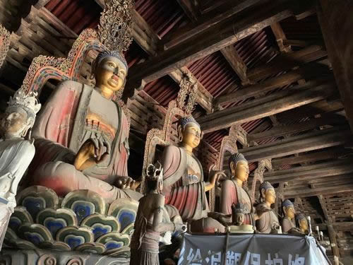 觀音閣內(nèi)中央的須彌座上,聳立著一尊高16米的泥塑觀音菩薩站像,菩薩頭部直抵三層的樓頂。因其頭上塑有十個小觀音頭像,故又稱之為“十一面觀音”,菩薩面容豐潤、慈祥,兩肩下垂,軀干微微前傾,儀態(tài)端莊,似動非動。觀音塑像兩側(cè)各有一尊脅侍菩薩塑像,塑像是遼代的原塑,雖制作於遼代,但其藝術(shù)風格類似盛唐時期的作品,是我國現(xiàn)存的最大的泥塑佛像之一。