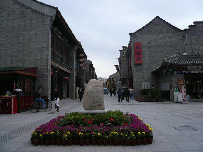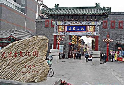 天津古文化街于一九八六年元旦建成開業(yè),整體建筑為仿清民間式建筑風格,天后宮(媽祖廟)位于全街的中心。全街近百家店堂,有經(jīng)營天津地方特色的楊柳青年畫的楊柳青畫社,經(jīng)營泥人彩塑的泥人張彩塑工藝品經(jīng)營部,有經(jīng)營文房四寶,名人字畫的四寶堂,春在堂,有經(jīng)營文物古玩的文物公司萃文齋門市部,還有經(jīng)營全國各地的景泰藍,雙面繡,牙玉雕,藝術陶瓷,中西樂器金銀飾品等上萬種名優(yōu)工藝品的幾十家店堂,各種商品貨真價實,物美價廉,商家以質量和信譽吸引中外游客。
